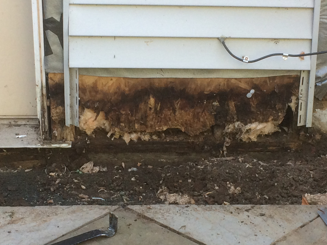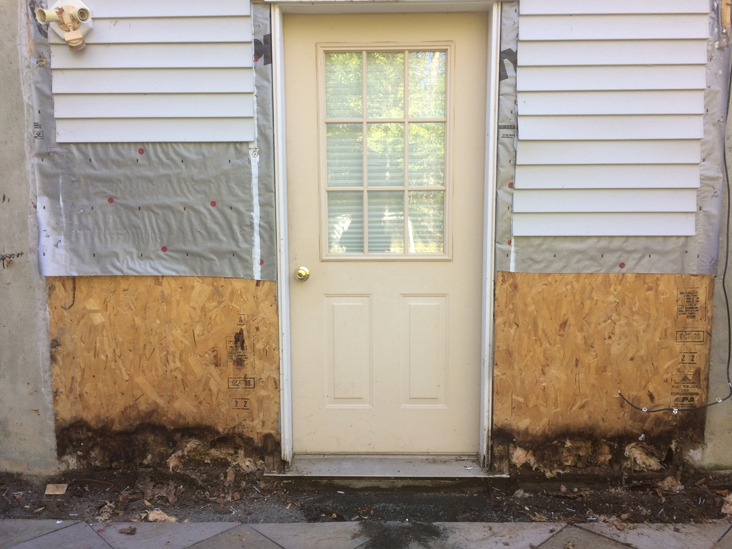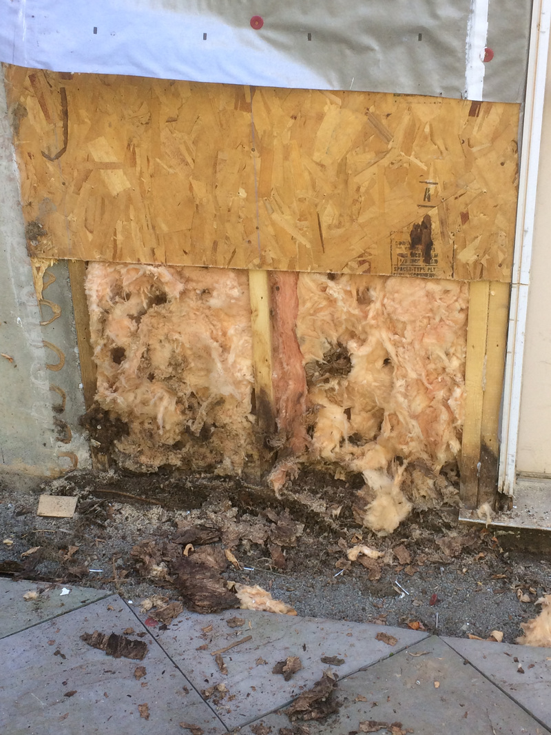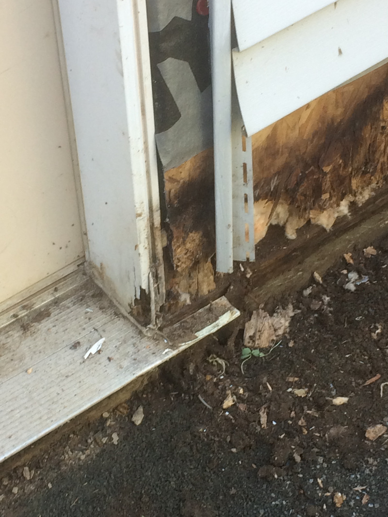 Repair consisted of removal of vinyl siding, cutting away rotted aspenite sheathing, removal of wet fiberglass insulation, door removal and rot in framing.