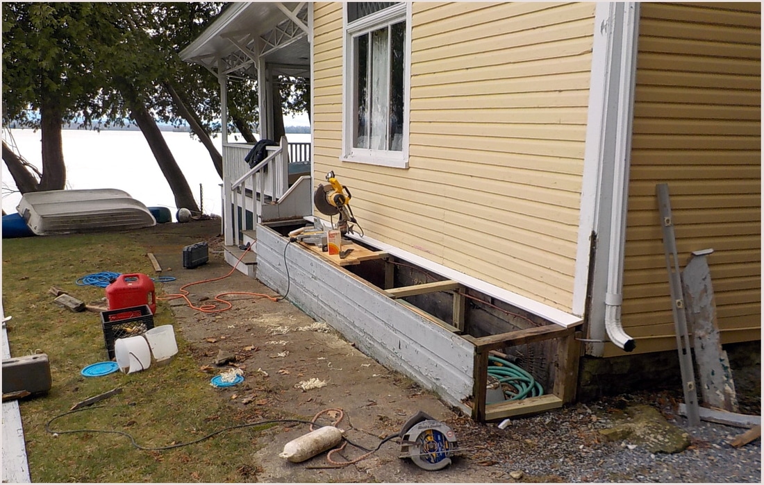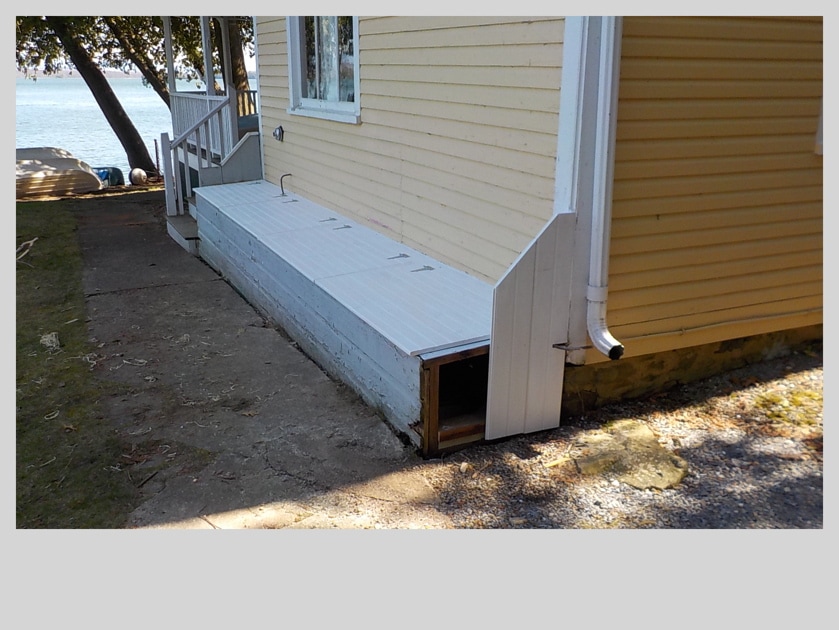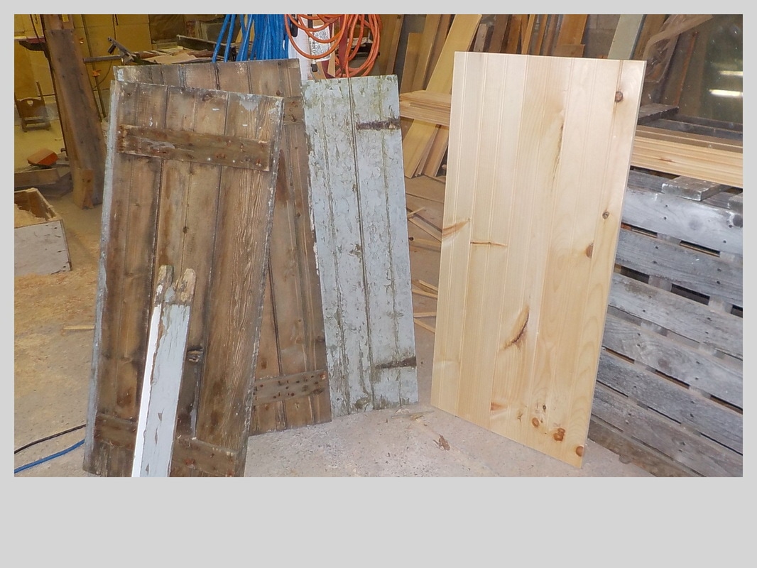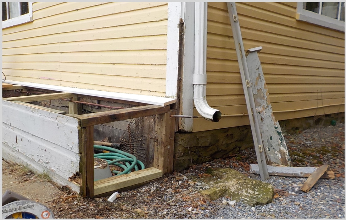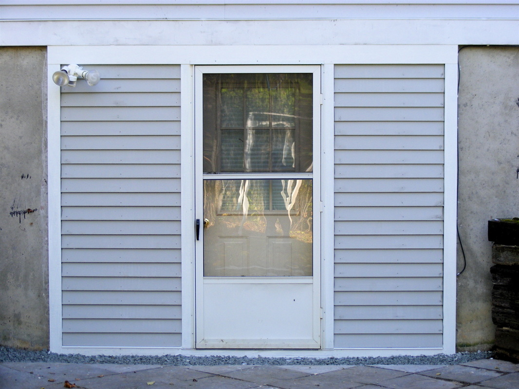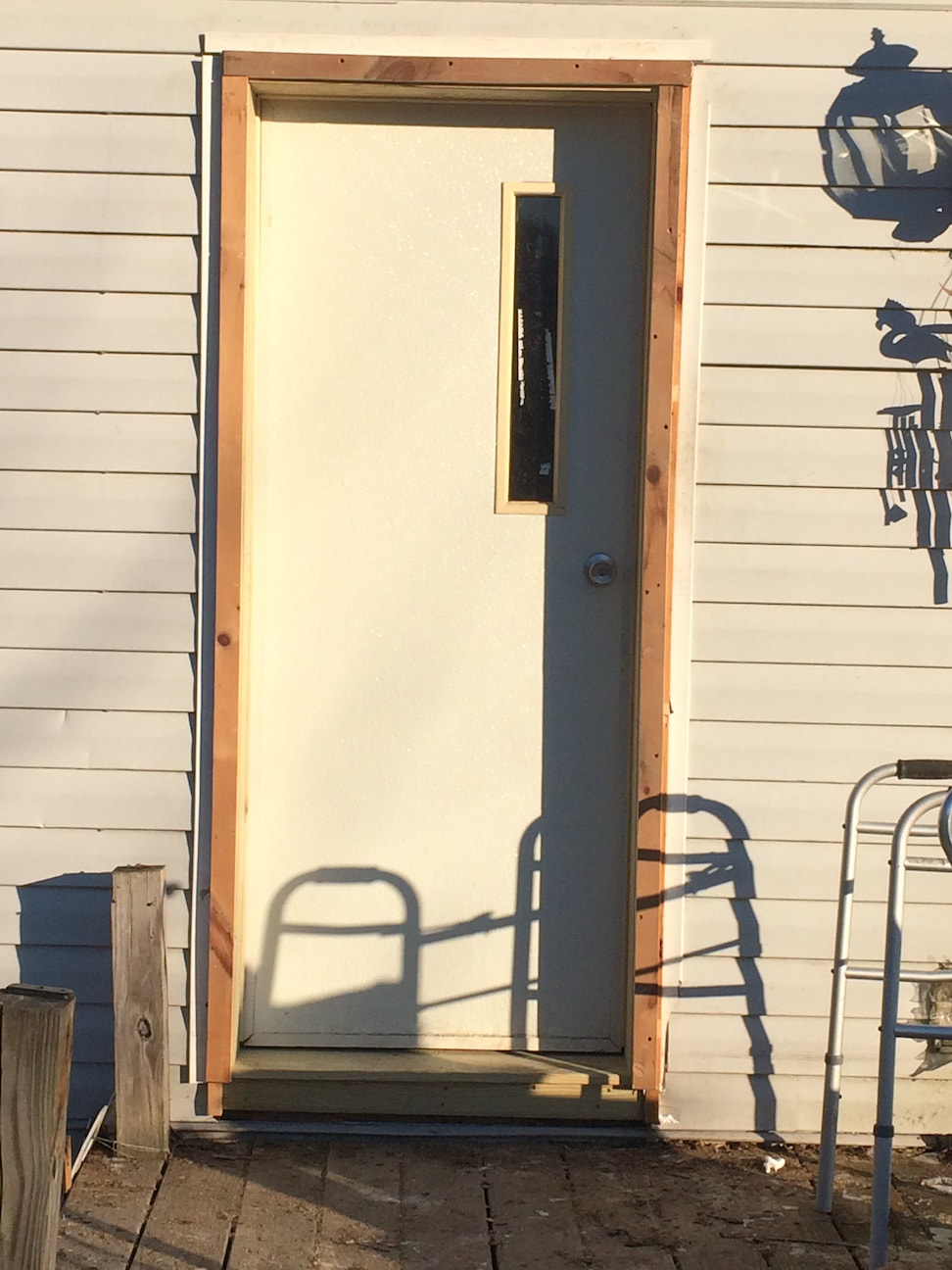 Replacement materials are cedar framing, pressure treated plywood sheathing, custom cut pressure treated 5/4 trim, pre-primed western red cedar clapboards, mildew resistant paint for trim and new door frame along with appropriate flashing and caulking not included in original construction..