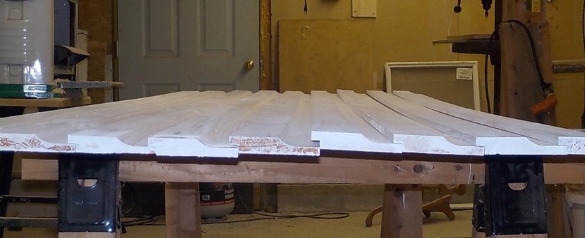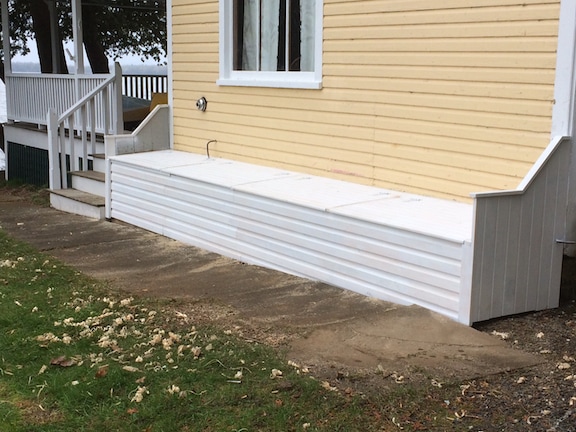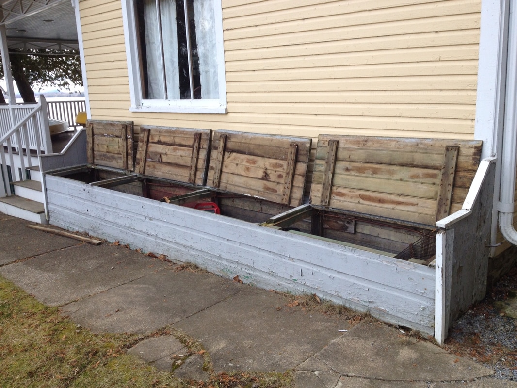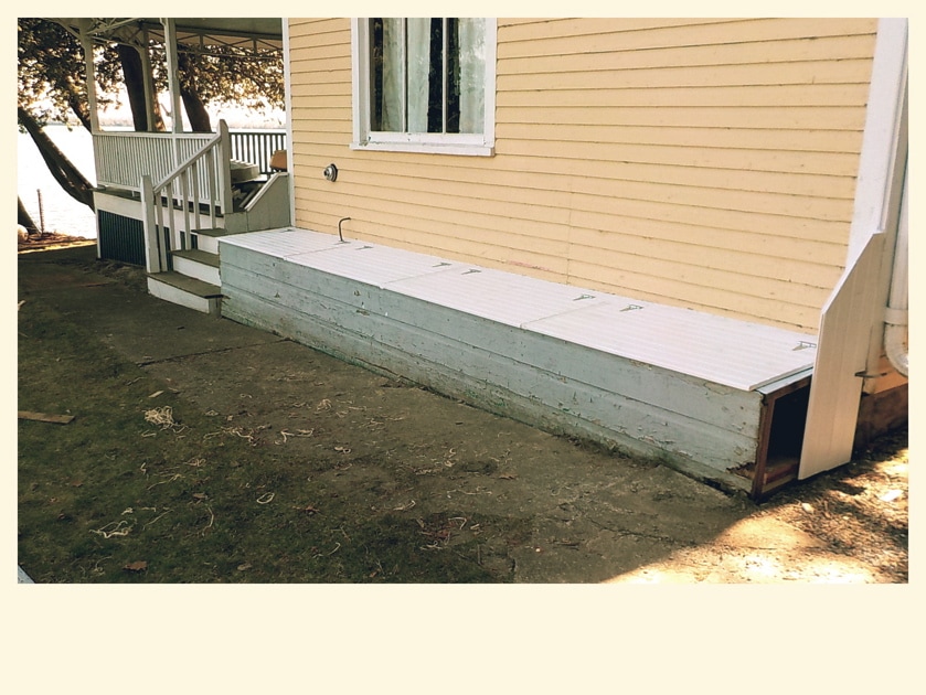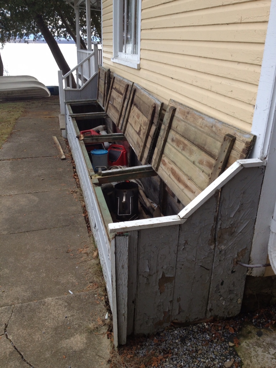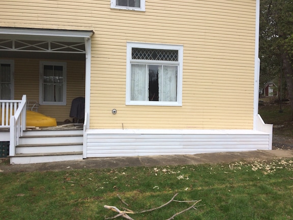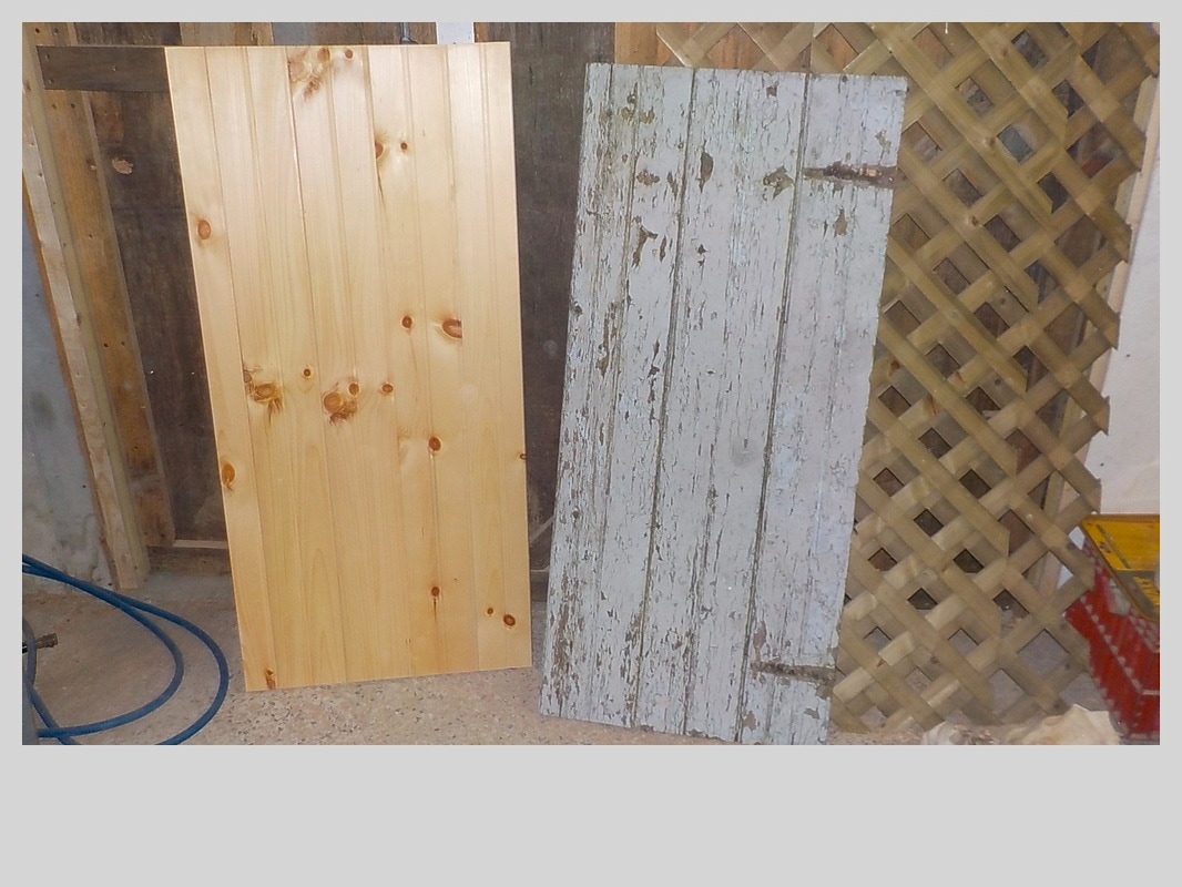 Replacement materials are cedar framing, pressure treated plywood sheathing, custom cut pressure treated 5/4 trim, pre-primed western red cedar clapboards, mildew resistant paint for trim and new door frame along with appropriate flashing and caulking not included in original construction..