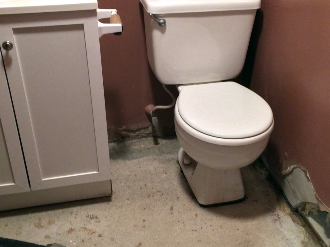 Once the toilet and vanity are out of the way it will make sense to just cut a piece out across the entire bottom and place a new clean piece in there instead if trying to patch up multiple ragged holes and dents.