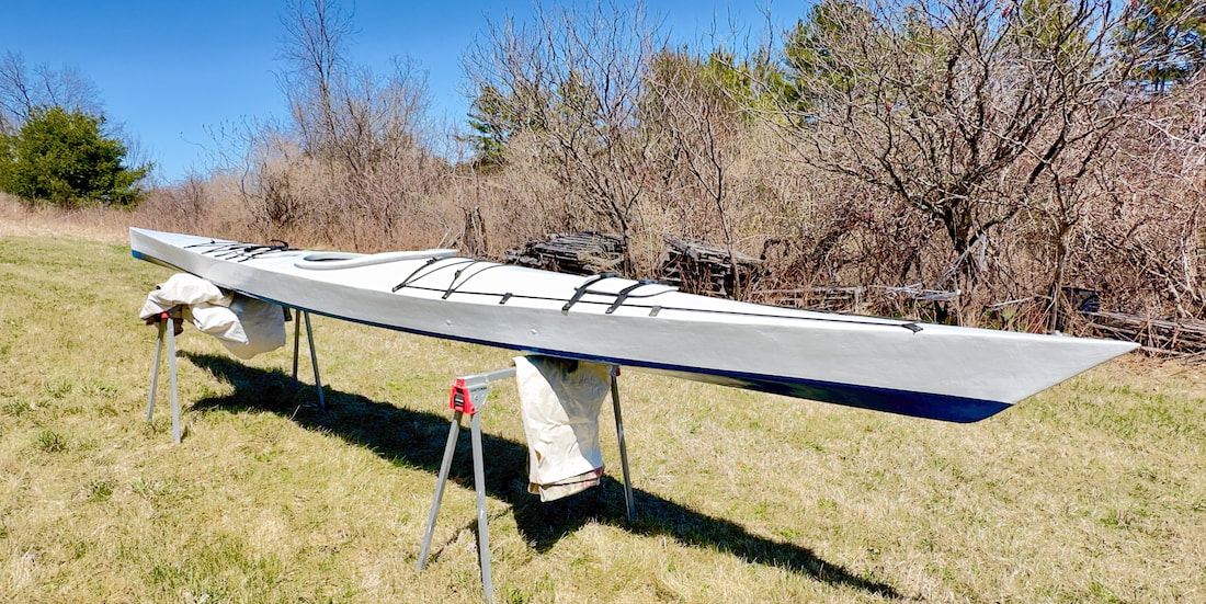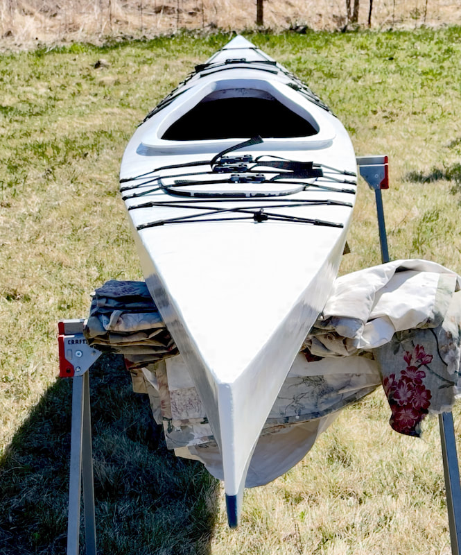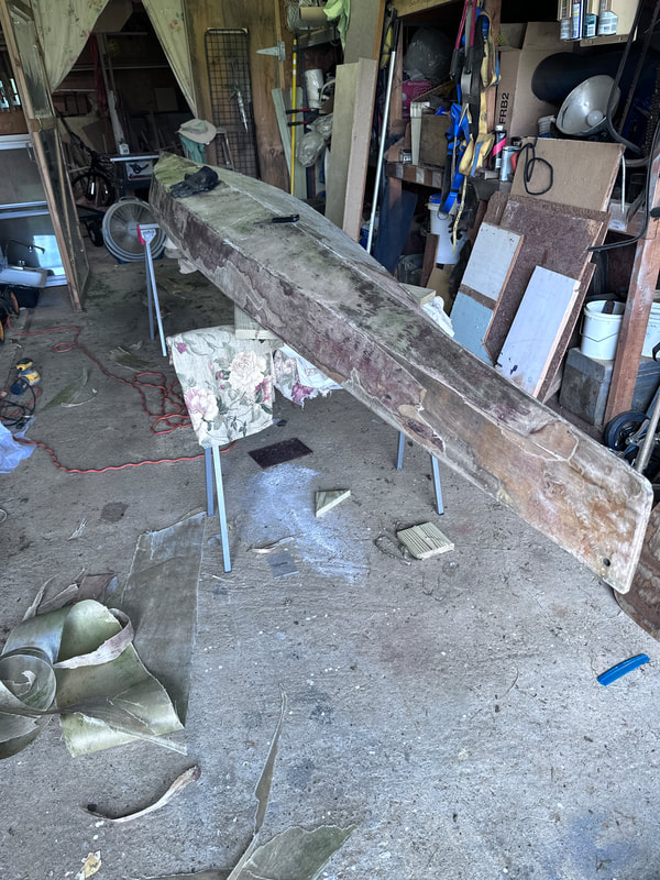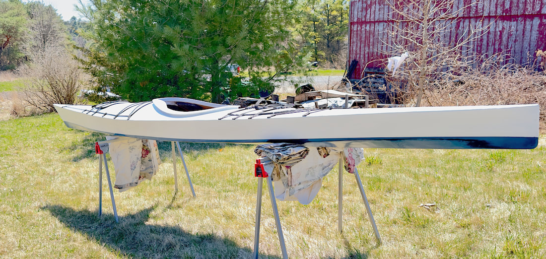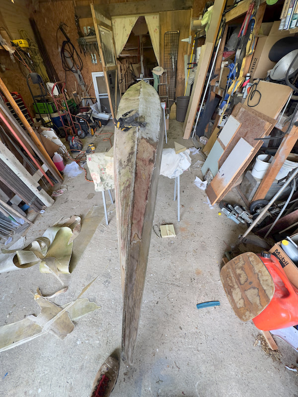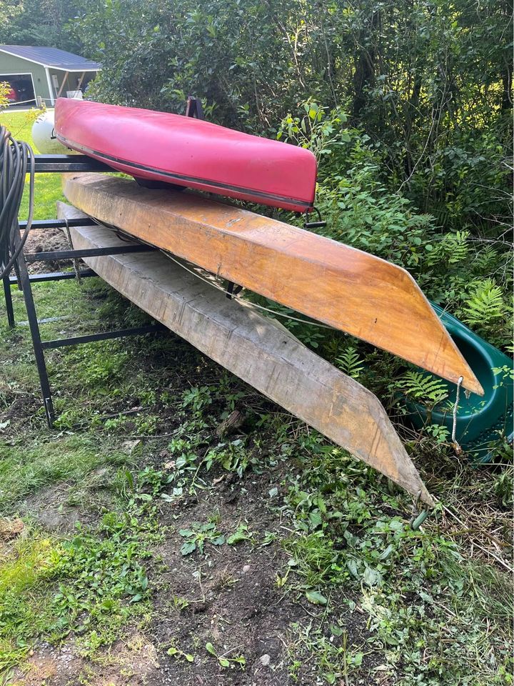 This kayak was found alone and abandoned(It's the one on the bottom in the first three pictures) at a camp up north by the Canadian border and I rebuilt it over this past winter, starting by stripping away all the old fiberglass cover, paint, fillers whatever was on it and getting it right down to it's bare wood again then reenforcing the seams with fiberglass cloth, and West System Epoxy, much sanding and then fiberglass strand mat and epoxy wrapped all around after that and Interlux filler for smoothing before painting with oil paints. I used "Interlux" epoxy primer sealant is the base coat. The inside is finished with Spar Varnish. This is being written on April 16, 2025. She is currently for sale for $1,500.00. Includes free delivery within Addison County Vermont. The tan one in the first three pictures is currency undergoing renovation as well. Stay tuned!