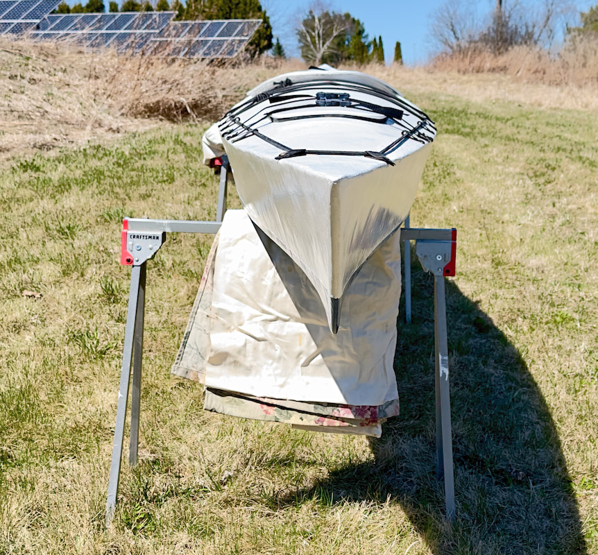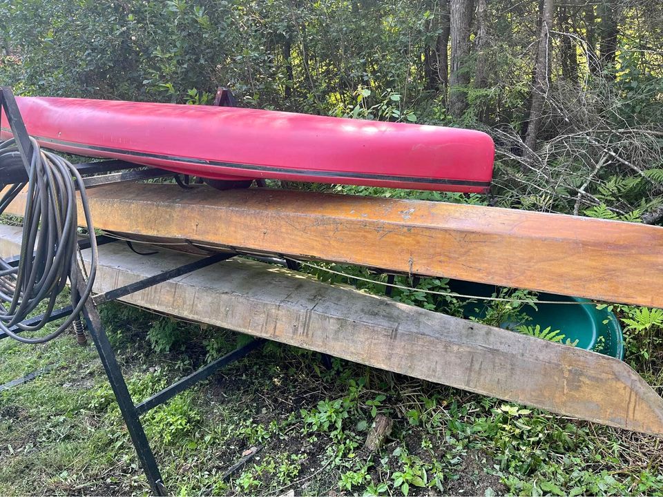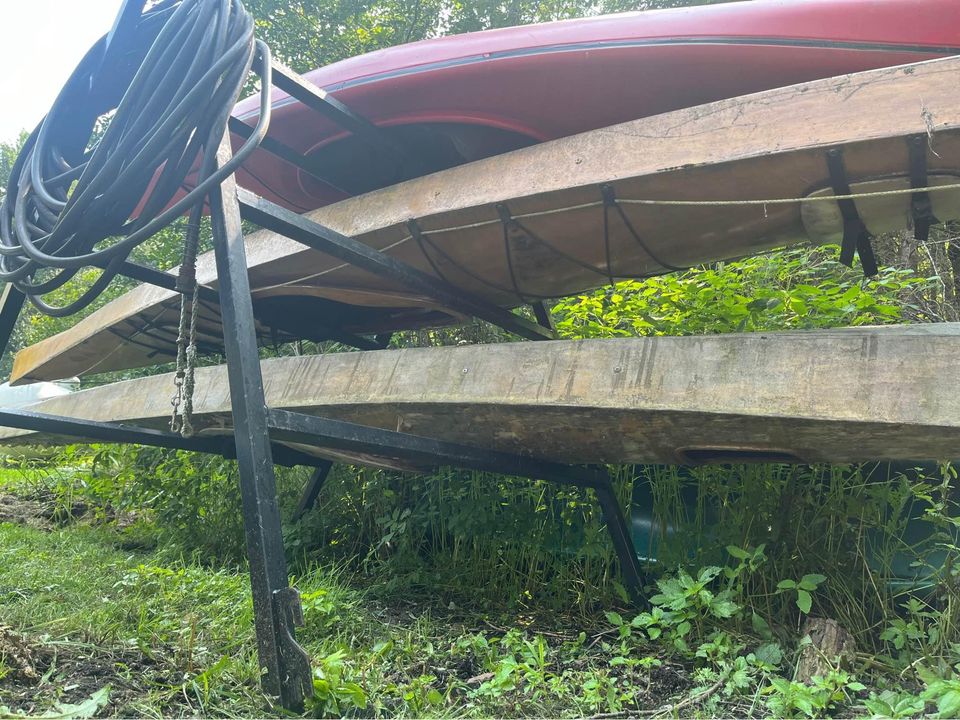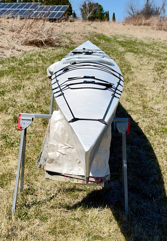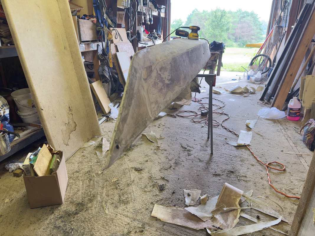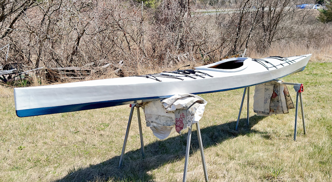 This kayak was found alone and abandoned(It's the one on the bottom in the first three pictures) at a camp up north by the Canadian border and I rebuilt it over this past winter, starting by stripping away all the old fiberglass cover, paint, fillers whatever was on it and getting it right down to it's bare wood again then reenforcing the seams with fiberglass cloth, and West System Epoxy, much sanding and then fiberglass strand mat and epoxy wrapped all around after that and Interlux filler for smoothing before painting with oil paints. I used "Interlux" epoxy primer sealant is the base coat. The inside is finished with Spar Varnish. This is being written on April 16, 2025. She is currently for sale for $1,500.00. Includes free delivery within Addison County Vermont. The tan one in the first three pictures is currency undergoing renovation as well. Stay tuned!