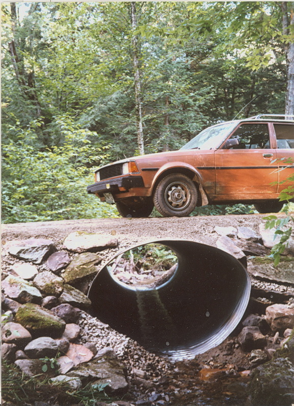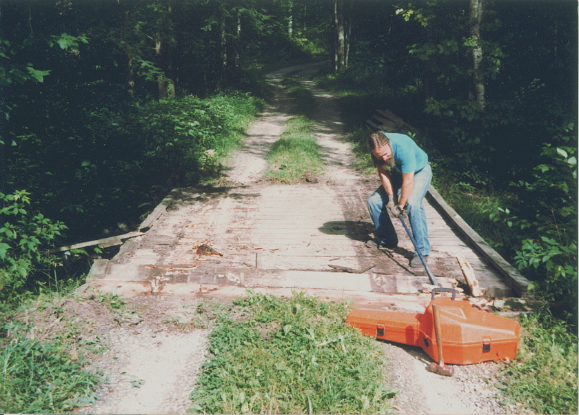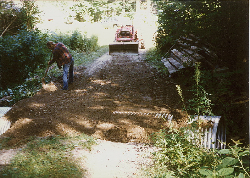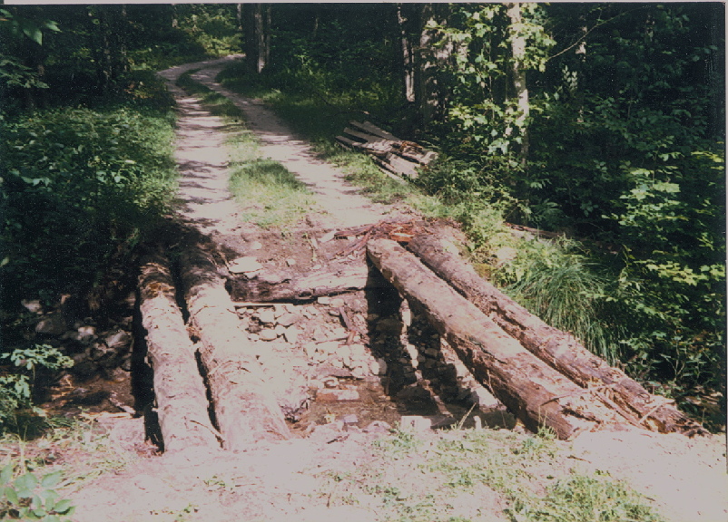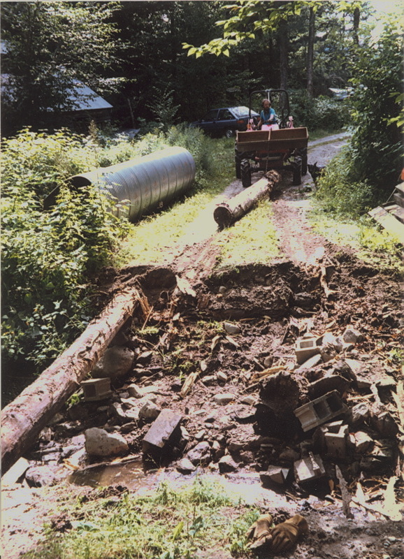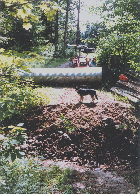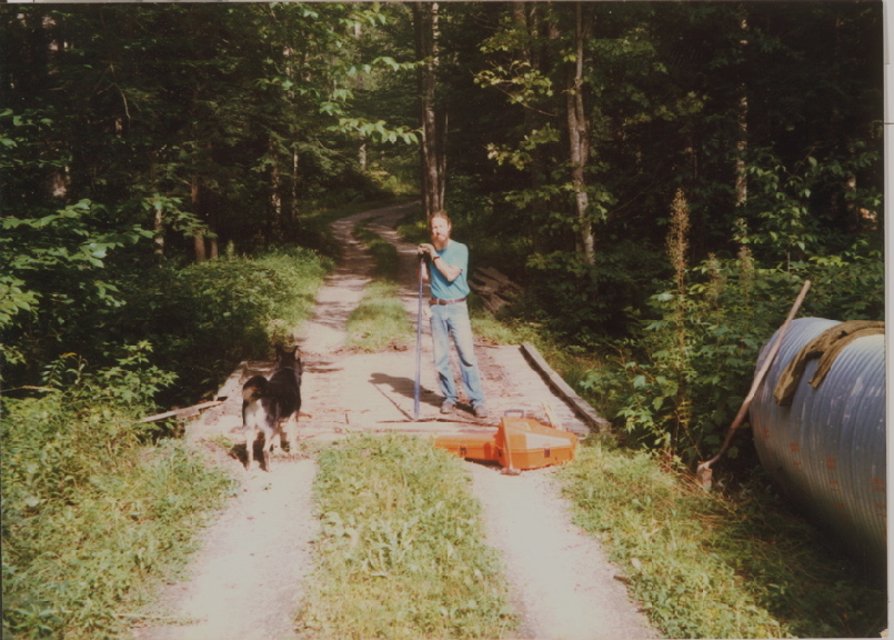 Everything wears out sooner or later. This old log bridge with a wooden deck lasted a long time but it finally became dangerous and the gully underneath had become too narrow to carry the volume of water that heavy rains of Vermont could deliver. Due to the shallow depth and wide expanse, a culvert called an "Arch" was used for replacement. The arch culvert is assembled and then compressed to make it more oval shaped than round. The following pictures show the removal process and final result once completed. Sorry about the image quality. They were scanned from pictures taken back in 1990's. That handsome guy in the pictures is me. The dog's name is Lobo.