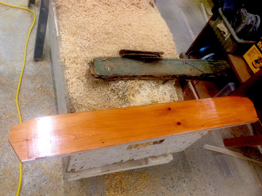 Then removal of the rotted tail pieces and addition of some flourishes like the transom handles with an oak base.